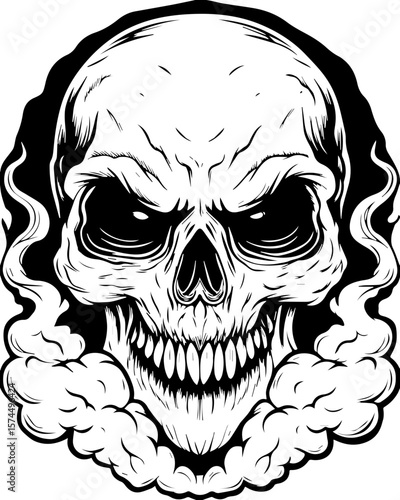 SVG of flaming skull characters in a bold dynamic style. Monochrome Skull Illustration with Fierce Expression and Smoky Effect
