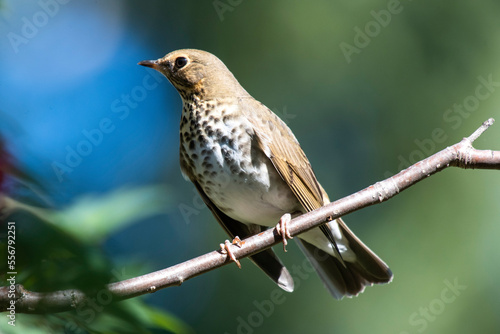 Swainson's Thrush (Catharus ustualtus) perched on a tree branch; Fairbanks, Alaska, United States of America