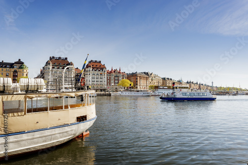 Sweden, Stockholm, Nybroviken, Tourboat leaving harbor