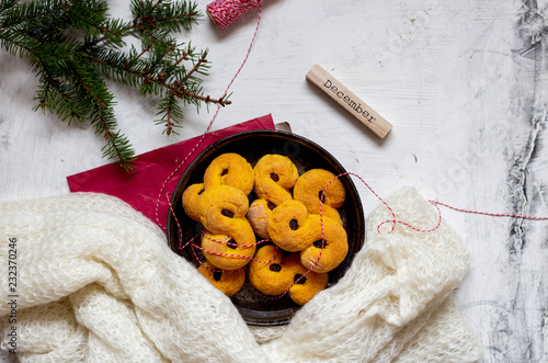 Swedish christmas. Gluten free version Traditional swedish buns in christmas setting. A saffron bun, in Swedish lussebulle or lussekatt.