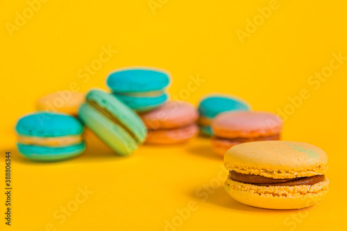 Sweet almond colorful unicorn pink blue yellow green macaron or macaroon dessert cake isolated on trendy yellow modern fashion background. French sweet cookie. Minimal food bakery concept. Copy space