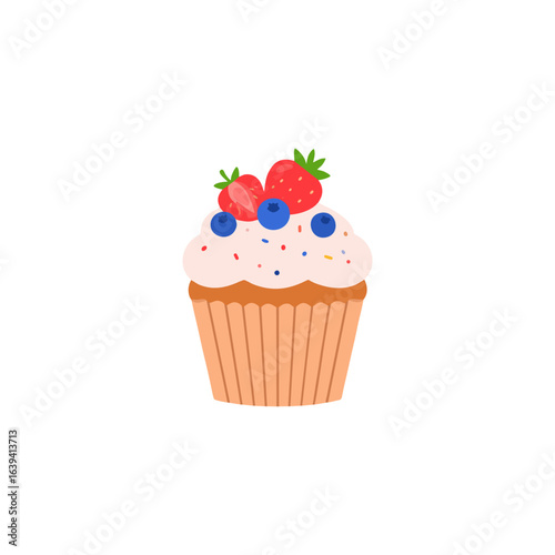 Sweet cupcake illustration with creamy white frosting, decorated with fresh strawberries, blueberries, and colorful sprinkles.