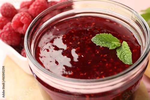 Sweet raspberry jam in glass jar, berries and mint on table, closeup