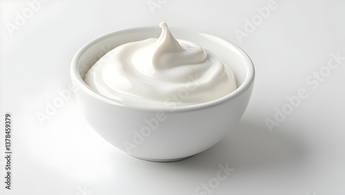 Swirl of Smooth White Greek Yogurt in a White Bowl, Creamy Dairy Dessert, Healthy Eating, High Protein Snack, Minimalist Food Photography on a White Background.