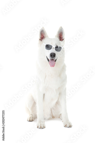 Swiss shepherd dog in sunglasses on white background