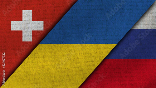 Switzerland and Ukraine and Russia Realistic Texture Flags Together - 3D Illustration