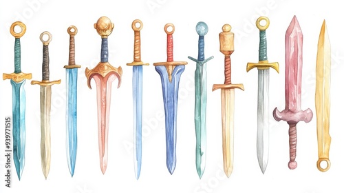 sword, watercolor, illustration, weapon, mediaeval, blade, steel, knight, sword, warrior, battle, white, watercolor, background, sharp, cartoon, metal, hilt, isolated, set, collection, historical, fantasy, combat, war, ancient, fenced, rapier, broadsword, saber, scimitar, dagger, art, decorative, military, armoury, cosplay, prop, antique, handle, hand-drawn, hand-drawn, pommel, edge, point, knife