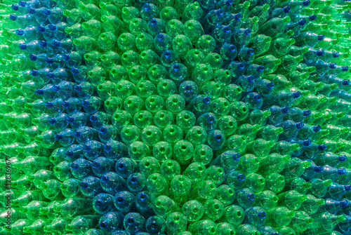 Sydney, Australia - December 11, 2009: Giant christmas tree made of red and blue plastic bottles. Closeup or detail of part of side.