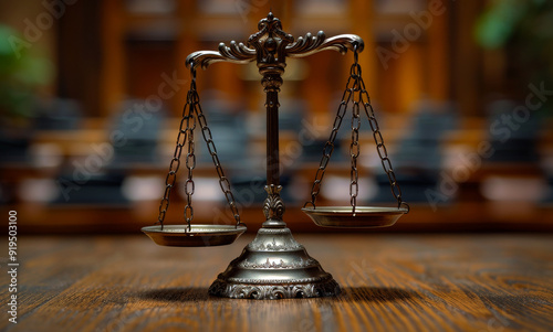 Symbol of justice on wooden table in courtroom setting.