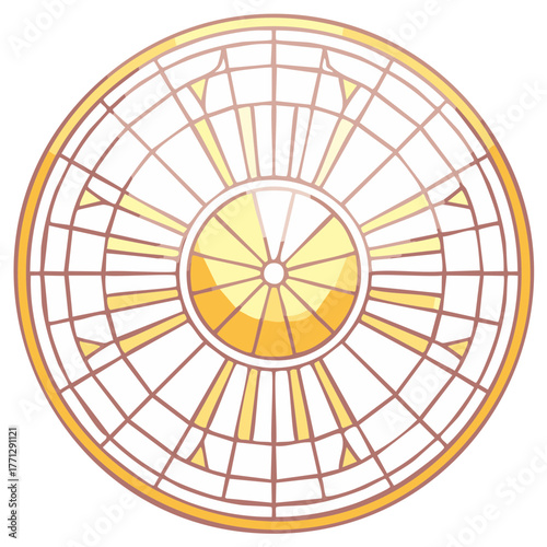 Symmetrical golden yellow stained glass window with intricate circular geometric patterns vector art
