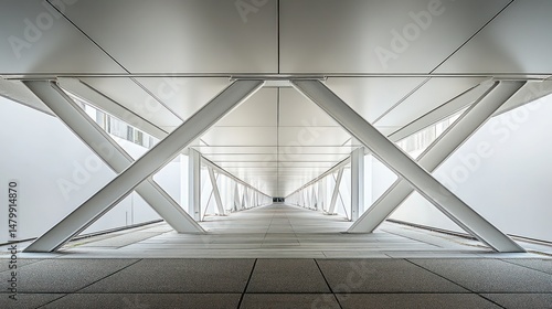 Symmetrical white walkway with repeating structural supports, leading to a vanishing point
