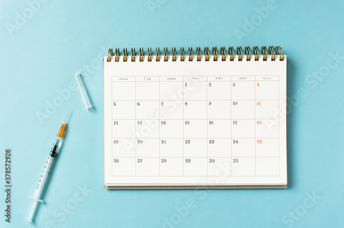 Syringe and calendar. Vaccinations, medicines, vaccines, flu injections, illnesses, antibiotics, outpatients, insulin, etc. 注射器とカレンダー。予防接種、薬、ワクチン、インフルエンザ注射、抗生物質、インスリン、通院など