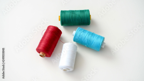 Szpule nici przygotowane do szycia leżące na białym tle