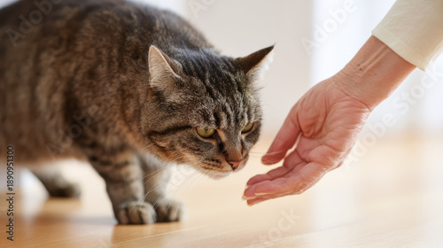 Tabby cat sniffing elderly hand offering food in warm indoor setting with soft natural light, gentle interaction and calm mood