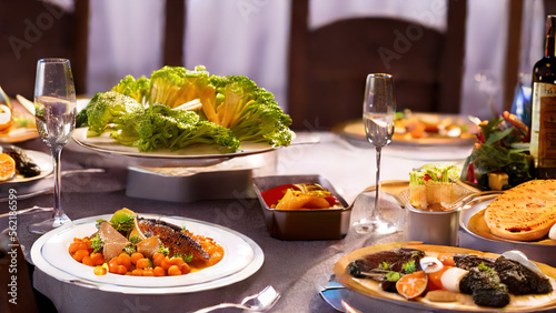table full of food, dinner, gourmet, traditional, restaurant, Generative AI