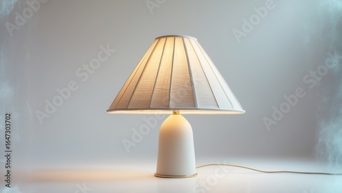 Table lamp with a shade on a white surface, illuminated, against a plain background.