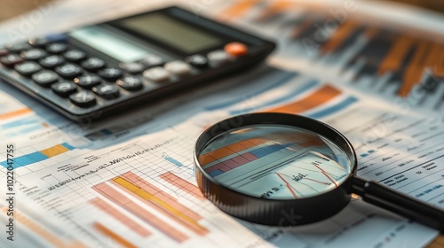 Table with business charts, graphs, magnifying glass, and calculator. Statistics, banking accounts, and financial progress.