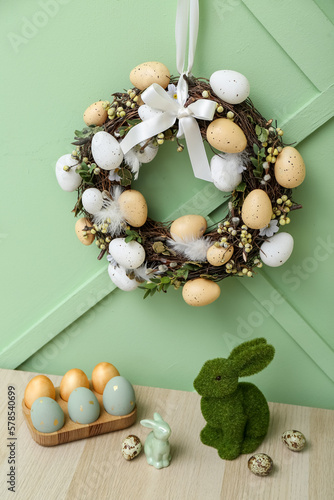 Table with Easter rabbits, eggs and wreath on green wall