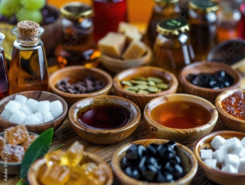 Table with many different types of food and drinks, including honey, syrup, and chocolate. The table is set for a gathering or party