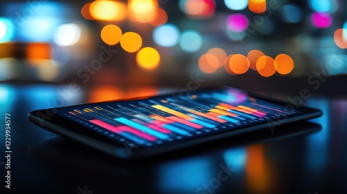 Tablet displaying colorful financial charts at night.