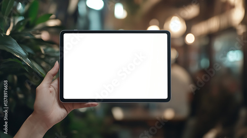 Tablet held in hand, cafe background