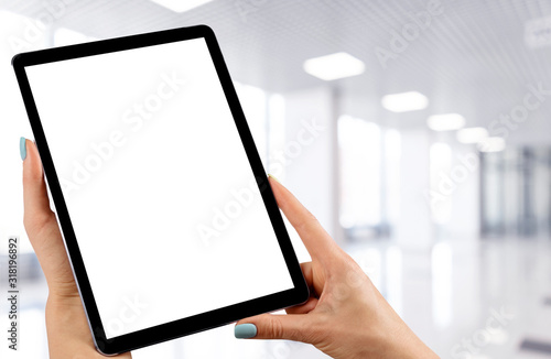 Tablet mockup in woman hand with business centre background. Modern tablet computer mock up with blank white screen. Empty space for text. Copy space. Isolated white screen. Clipping path