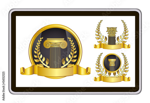 tablet pc computer. gold laurel wreath, ribbon, pillar