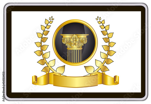 tablet pc computer. gold laurel wreath, ribbon, pillar