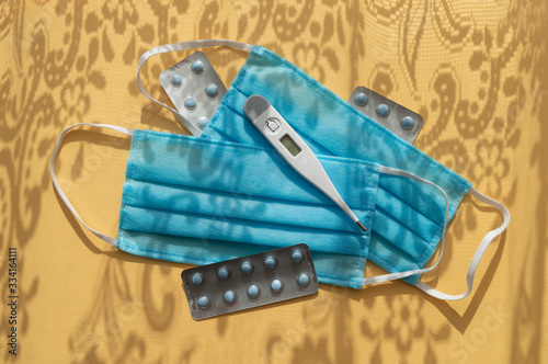 Tablets, thermometer and two blue medical masks on the yellow background with shadows ornaments againts virus covid-2019. Heath care concept, stop coronavirus