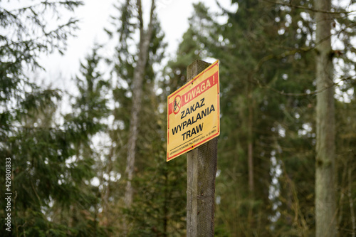 Tablica informacyjna zakaz wypalania traw ,puszcza Białowieska, Polska ,Europa.