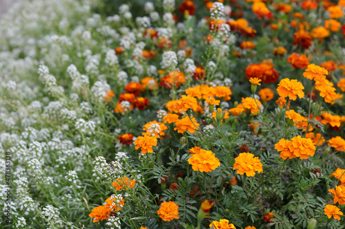 Tagetes. Yellow and orange marigolds on a flower bed in the garden. Autumn background. Yellow and white autumn flowers. Beautiful wallpaper of marigolds flowers. Postcard, greetings, banner .