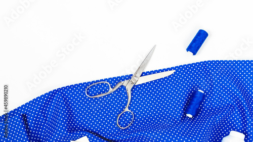 Tailor's work desk. Sewing accessories: thread and scissors, chalk, blue fabric on white background
