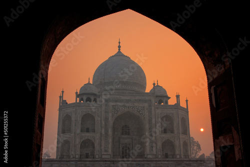 Taj Mahal at sunrise framed with the arch of the mosque, Agra, Uttar Pradesh, India