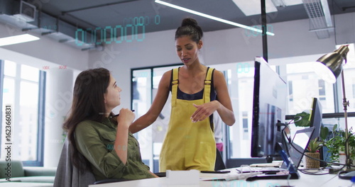 Talking standing colleague gesturing toward seated coworker at open-plan office, with dual monitors