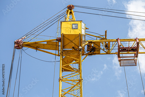 Tall building under construction with scaffolds,Freestanding tower crane on a building site.Building construction site work against blue sky