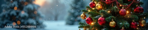 Tall Christmas tree adorned with red and gold balls and ribbons, decorations, tree, winter landscape