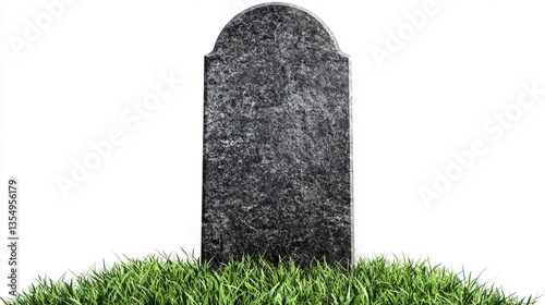 Tall classic headstone in grey stone with a polished surface, resting on a lush grass base, isolated on transparent background for solemn memorial applications.