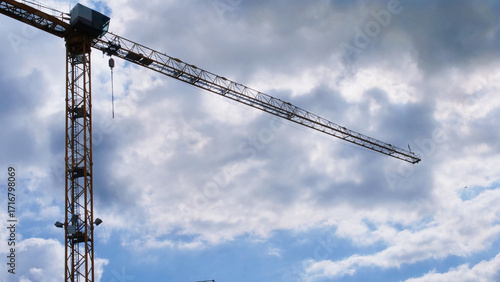 Tall construction crane with long jib against dramatic cloudy sky—urban development, engineering machinery, and industrial infrastructure in progress, captured from low angle.
