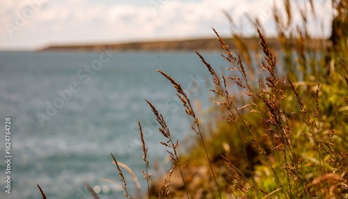 Tall grasses along the water's edge dance in the breeze