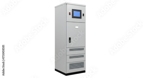 Tall Gray Data Storage Server Cabinet with Digital Display in Data Center