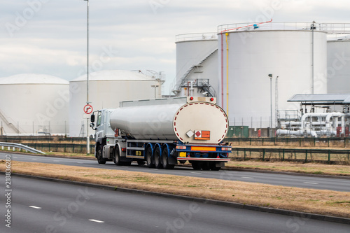 Tanker lorry in motion on the road with oil depot in the background