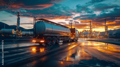 Tanker Truck to transport fuel in industrial petroleum plant. Closeup of fuel truck at oil depot Concept Transportation Fuel Industry Oil Depot Operations Refueling Process Closeup