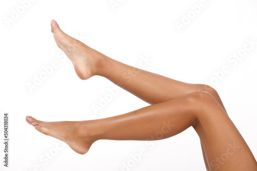 Tanned skin Woman show legs knee foots toe naked as body parts over white background isolated