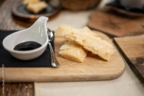 Tasting of different matured and very old parmesan Parmigiano-Reggiano hard cheese and balsamic vinegar of Modena in Parma, Emilia Romagna, Italy