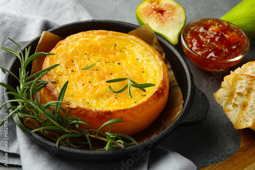 Tasty baked brie cheese and products on grey table, closeup