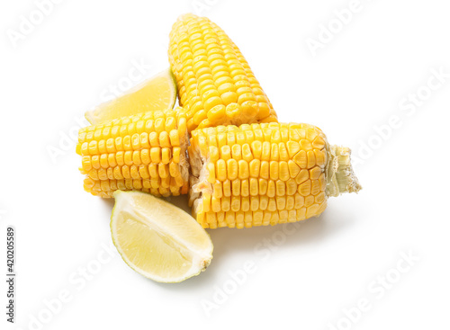 Tasty baked corn cobs on white background