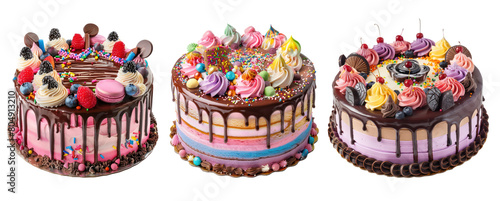 tasty birthday cake with chocolate drip in set of three