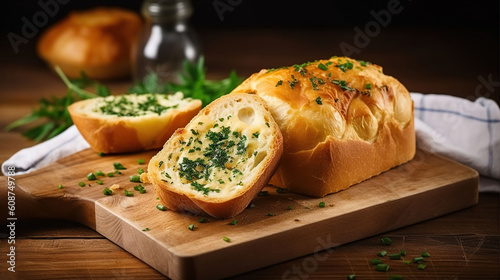 Tasty bread with garlic, cheese and herbs on kitchen table. Generative AI