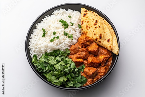 Tasty curry bowl featuring chicken, steamed rice, fresh herbs, and flatbread served on a white background