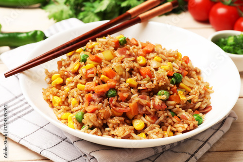 Tasty fried rice and chopsticks on light wooden table, closeup